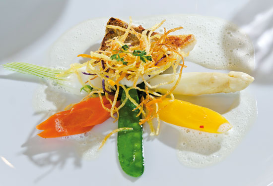 In regelmäßigen Abständen werden Schulungen abgehalten, um das Sous-Vide Garen zu optimieren. „In der Küche lernt man nie aus“, so Kaufmann, der drei Jahre lang Seite an Seite mit Alfons Schuhbeck kochte. Giovanni, Sternekoch aus München und begeisterter Sous-Vide Koch, ist bereits zum zweiten Mal in Rosshaupten. Wieder gelingt es ihm, die Küchenbrigade zu begeistern. Es sind kleine Tricks und Kniffe, die manches bei dieser Garmethode einfacher machen. „Mit dem Sous-Vide Garen haben wir die Möglichkeit, die Zeit für Kreatives zu nutzen – denn das Auge isst mit“, so Hans Georg Kaufmann. Sein Vier-Sterne-Haus ist für die gute Küche bekannt – bodenständig und doch immer wieder elegant und innovativ in Szene gesetzt. Erst jetzt bekam das Hotel wieder den BIB Gourmand Preis vom Guide Michelin verliehen. Eine Auszeichung die nur zwei Häuser im Allgäu erhalten haben. Mit dem BIB Gourmand Preis werden Restaurants mit einem sehr guten Preis-Leistungsverhältnis ausgezeichnet, die „nahe am Stern“ kochen.