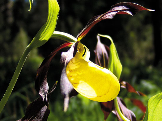 Wie der Name schon sagt, bildet diese auffällige und besondere Orchideenart eine schuhförmige Blüte. Die große, bauchige Lippe ist gelb gefärbt, während die verzwirbelten Blütenblätter rotbraun im Sonnenlicht leuchten. Die bis zu 70 cm hohe Orchidee ist meist ein- bis zweiblütig, in seltenen Fällen sind dreiblütige Exemplare zu bewundern. Die Blüte ist als Insektenfalle ausgebildet, wobei der gelbe Schuh als Lockmittel dient. Die neugierigen Besucher fallen vom glatten Rand in das Innere des Schuhs. Eine durchscheinende Stelle am hinteren Ende der Blüte signalisiert dem Insekt den Ausgang. Beim Durchschlüpfen des engen Fluchttunnels kommt es zur Bestäubung.