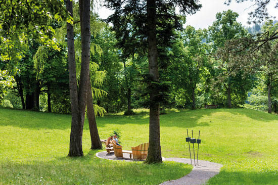 Die Themeninsel im Baumgarten ist eingerahmt von Bäumen, welche eine natürliche Ruheinsel schaffen. Auf der neu geschaffenen Kiesfläche wurden eine Doppelchaiselongue und eine Chaiselongue platziert. Die Trilogienadeln widmen sich den Themen Romantik, Baumgarten und Hohes Schloss.