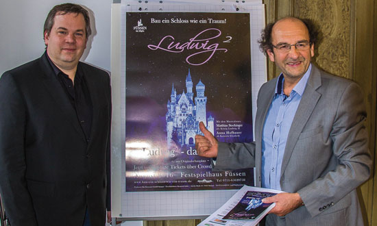 Theaterregisseur Benjamin Sahler stellte bei der Pressekonferenz im Rathaus Füssen die Rückkehr des Musicals „Ludwig²“ ins Festspielhaus vor. „Einige Managementfehler führten in der Vergangenheit zu den Insolvenzen der vorangegangenen Musicals“, so Bürgermeister Iacob. Aus diesen Fehlern habe man gelernt und daher plant die eingeschaltete Crowdfunding Plattform Startnext Network GmbH aus Berlin einen Ticketvorverkauf zu vergünstigten Konditionen. Bis Ende November sollen auf diesem Weg 75.000 Euro eingefahren werden, die die Finanzierung sichern. Wie Benjamin Sahler versichert, gehen die Ticketkäufer keinerlei Risiko ein. Einerseits sichern sie sich mit einem Ticket den vergünstigten Eintritt in eine Aufführung, andererseits werden keine Zahlungen fällig, bzw. werden zurück erstattet, sollte das Projekt wider Erwarten scheitern.