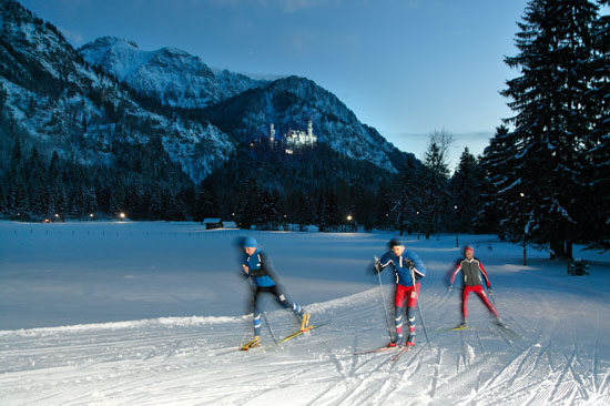 Nicht zuletzt ein Grund dafür, dass der Deutsche Skiverband die Loipen rund um das Dorf der Königsschlösser klassifiziert und als nordic aktiv Langlaufzentrum ausgezeichnet hat. Sechs bestens präparierte Loipen (auch Skating-Loipen) mit Schwierigkeitsgraden von leicht bis mittelschwer sind zu einem Netz verbunden. Auf über 32 Kilometern stehen dem Gast ein ausgedehntes und abwechslungsreiches Loipennetz für mehr oder minder forsche Runden zur Verfügung. Als besonderes Erlebnis gilt bei Einbruch der Dunkelheit die 1,7 Kilometer lange beschneite und beleuchtete Neuschwansteinloipe. Der Blick von der Loipe auf die schneebedeckten Königsschlösser lässt innehalten, verzaubert und entführt in eine märchenhafte Winterwelt. Ein weiterer Vorteil des Langlaufzentrums ist die unmittelbare Nähe zur Pistenabfahrt der Wintersport-Arena am Tegelberg. Auch zwei Skischulen stehen zur Verfügung (Verleih und Ausrüstung möglich). So wird ein Ausflug nach Schwangau den Bedürfnissen der ganzen Familie gerecht.
