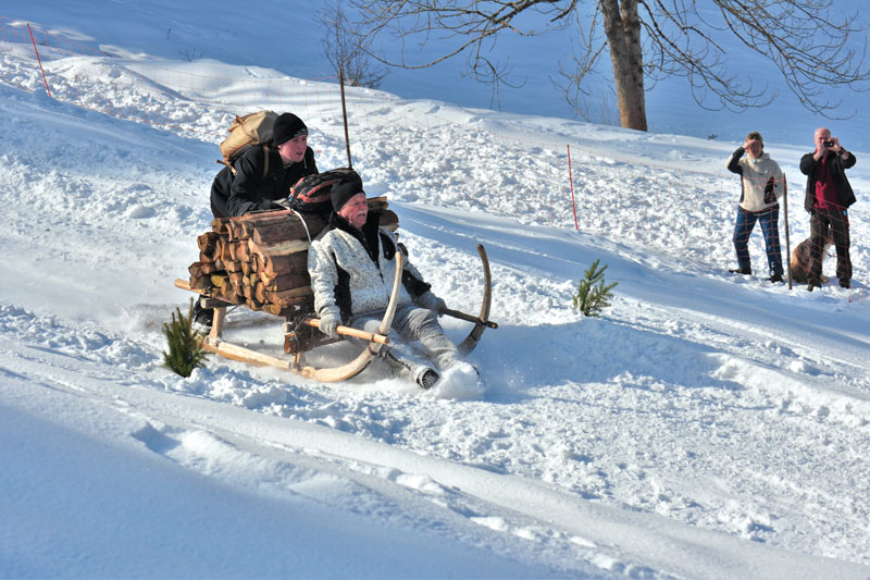 Bis Ende der 60er Jahre holten die Männer im Februar das im Sommer gemähte Heu runter ins Tal. Immer zu zweit liefen die Männer den mühsamen Weg zum Hündleskopf raus. Der eine den Weg schaufelnd während der andere den Schalenggen auf dem Rücken hoch trug. Bis zu vier Mal am Tag stapften sie den knapp zwei Kilometer langen, mühsamen Weg rauf. „Es war eine gefährliche Arbeit, die viel Konzentration und Erfahrung brauchte“, so Hanne Allgayer. Das Heu wurde ganz fest auf dem Schalenggen festgezurrt und mit Tannenzweigen beschwert. Bremsen gab es auf den Schlitten nicht, das übernahm der hintere Mann, während der vordere den Holzschlitten lenkte. Unterdessen kochten die Frauen „a gscheites Midagessen“ und bereiteten für den Abend eine deftige Brotzeit vor.