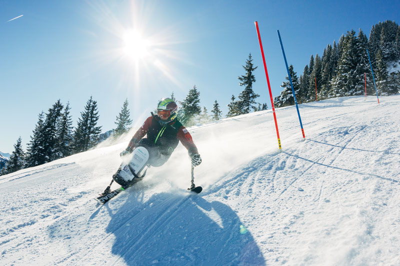 Seitdem sich Felix Leben vor einigen Jahren durch den Unfall schlagartig veränderte, musste er immer wieder Rückschläge hinnehmen. Der lange Weg zurück in die Normalität, insgesamt über 60 Operationen bis heute. Deswegen kann es für seinen Weg nur eine Richtung geben. „Für mich war es nach meinem Unfall einfach wichtig, dass ich wieder in den Bergen aktiv sein kann. Das kann ich im Sommer mit meinem Hand-Bike, da bin ich viel unterwegs. Im Winter ist der Mono Ski die beste Möglichkeit.“ Beim Mono Ski sitzt der Sportler auf einer Art gedämpftem Ski-Gerät, das er komplett über die Muskulatur des Schultergürtels steuern muss. Mit Hilfe von zwei Skikrücken kann dann das Gewicht ausbalanciert werden. „Bei guten Bedingungen ist das ja kein Problem“, erklärt Felix, „aber es ist schwer, konstant gute Leistungen abzurufen, weil die Bedingungen eigentlich meistens unterschiedlich sind.“ Insgesamt können sich die bisherigen Erfolge in dieser Saison aber durchaus sehen lassen. Ende Januar konnte Felix in der internationalen Rennserie bereits seinen zweiten Podest-Platz im Slalom einfahren. Besonders die Piste im tirolerischen Rinn liegt dem Mono-Ski-Fahrer, hier konnte er bisher immer überzeugen.