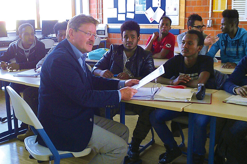 Laut Oberstudiendirektor Remigius Kirchmaier, dem Leiter der Berufsschule Ostallgäu, hat bereits jeder zweite Abschlussschüler der berufsschulpflichtigen Flüchtlinge einen Ausbildungsvertrag in der Tasche oder in Aussicht. Beim Gespräch zwischen den jungen Flüchtlingen und Wengert erfuhr dieser viel über die Herkunft, den bisherigen Lebensweg und die Berufsvorstellungen der jungen Flüchtlinge. Diese reichen von technischen Berufen bis hin zu Berufen im Dienstleistungsbereich, z.B. als Friseur oder in der Krankenpflege. Ein Teil der Flüchtlinge hat bereits im Heimatland eine Ausbildung absolviert und ergänzt jetzt sein Wissen, wie ein junger Frisör, der nun noch Damenhaarschnitte lernen muss.