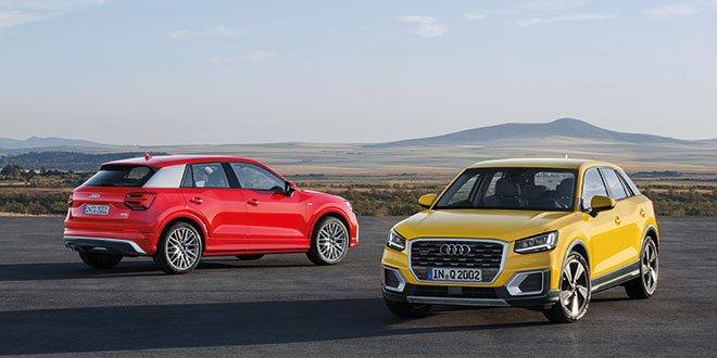 Schon auf den ersten Blick lässt der Q2 die Muskeln spielen. Mit breiten Schultern und kantigen Zügen strotzt er vor Energie und Selbstbewusstsein. Die Dachlinie sowie das niedrige Glashaus erinnern an ein Coupé und lassen den Lifestyle-Sportler geduckt dastehen. Besonders markant: die keilförmigen Scheinwerfer, der hoch positionierte Singleframe-Grill und üppige Lufteinlässe. Ein langer Dachkanten-Spoiler und ein Diffusor in Unterfahrschutz-Optik formen einen knackigen Hintern. Dahinter verbirgt sich ein großes Ladeabteil mit viel Platz für Sportequipment oder Großeinkäufe. Die Heckklappe öffnet und schließt auf Wunsch elektrisch. Praktisch: Eine Durchlade in der Rückbank macht den Transport von Skiern und Regalböden zum Kinderspiel.