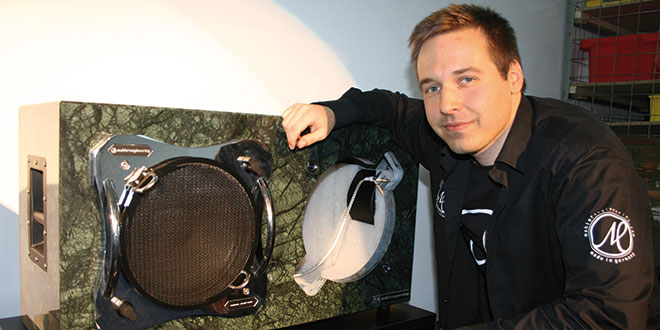 Diese speziellen Gitarren-Lautsprecher hat Simon Mahler völlig selbstständig entwickelt, versehen mit einigen Funktionen, über die bisherige Produkte dieser Art nicht verfügen. So lassen sich die Lautsprecher unter anderem durch ein ausgeklügeltes System ganz einfach und leicht auswechseln. „Dadurch ergeben sich für Musiker völlig neue Möglichkeiten“, erklärt der Tüftler. „Jede Gitarre, von der Akustischen bis hin zur Bluesgitarre, hat einen eigenen Klang, der durch bestimmte Arten von Lautsprechern enorm unterstützt werden kann.“ Das Gehäuse besteht aus Naturstein, wahlweise Granit oder Marmor, und bietet allein dadurch einen makellosen Klang, denn schließlich verhindert der schwere Stein eine Schwingung des Gehäuses, der Körper der Boxen kann so nicht mehr vibrieren. Durch Öffnungen an der Hinterseite lässt sich zudem eine offene oder geschlossene Rückwand simulieren, was zusätzliche Unterschiede im Klang ausmacht. Ein Gitarrist kann damit also den perfekten Sound seines Instruments realisieren.