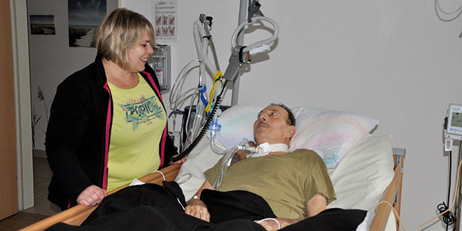 Fünf Tage in der Woche ist ihr morgendliches Ritual das Gleiche. „Ich schließe unsere WG auf, ziehe mich um und begrüße jeden Bewohner“, erzählt sie. Herr K. ist einer der drei Bewohner. Er hat eine chronisch obstruktive Lungenerkrankung, die eine permanente Beatmung erfordert. Nachdem seine Tochter, die in der Schweiz lebt, bei der Intensivpflege Becker einen Platz fand, holte sie ihren Vater aus Neuburg an der Donau nach Füssen. „Es war für mich eine Umstellung“, haucht er leise. In seinem Zimmer hängen Bilder von seiner Familie. Von seinem Bett aus schaut er auf den Garten und seine Terrasse. Er ist froh hier zu sein. „Es ist gut“, haucht er wieder leise. Vier Zimmer hat die Intensiv-Wohngemeinschaft. Drei davon sind besetzt, ein vierter Bewohner wird bald einziehen. Wohngemeinschaften für Intensivpflegebedürftige Menschen gibt es nur wenige. Erst seit einem Jahr gibt es die Wohngemeinschaft in Füssen. Es ist auch die Erste, so Martin Becker. Ein Team examinierter Fachkräfte kümmert sich um die Betreuung und Pflege der Bewohner in der Wohngemeinschaft, und das rund um die Uhr. Logopäden, Physiotherapeuten und Ergotherapeuten sowie Wundexperten kommen täglich ins Haus. Die Atmosphäre ist freundlich, warm und offen. Helle Farben ziehen sich durch die 208 Quadratmeter große Wohnung, die auf den ersten Blick nicht preisgibt, dass hier schwerkranke Menschen leben. „Wir arbeiten hier in der Bezugspflege“, erklärt Martin Becker. Er ist der Chef von 85 Mitarbeitern.