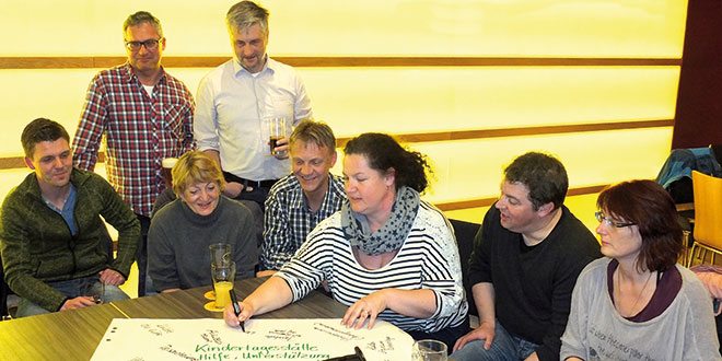 Pfarrer Frank Deuring, Leiter der PG war hocherfreut über den guten Besuch der Infoveranstaltung im Füssener Soldatenheim und erläuterte eingangs die nicht besonders erfreulichen Fakten zum baulichen Zustand der kirchlichen Gebäude. Der marode Kindergarten wird aus Kostengründen nicht saniert, es steht fest, dass absolut nur ein Neubau infrage kommen kann. Auch für die Pfarrkirche, würden in den kommenden Jahren etwa 900.000 Euro für Restaurierung notwendig sein. Ein Abriss der Kirche ist mittlerweile kein Tabuthema mehr, da inzwischen feststeht, dass seitens des Denkmalsschutzes keine Einwände bestehen. Bernhard Fendt und Dr. Thomas Wienhardt von der Diözese Augsburg, die auch die ins Leben gerufene Projektgruppe leiten führten als Moderatoren durch den Infoabend. An sechs Tischen hatten die Besucher in drei Runden von je 20 Minuten Zeit ihre Ideen, Visionen, Vorstellungen und Gedanken zu den vorgegebenen Themenblöcken: „Ort für Veranstaltungen“, Offenzugänglicher Treffpunkt“, „Neuer Kirchenraum“, „Ki-Ta Hilfe und Unterstützung“, „Was sonst noch – ganz andere Ideen“, „Vielfalt der Kulturen in der PG“ und „Action, Spass, Events“ zu Papier zu bringen. In kurzen Resümees der Tischgruppen wurde die Vielzahl und Vielfalt der vorgebrachten Ideen, Visionen und Wünsche kurz für Alle zusammengefasst. Alles ist festgehalten, wird mit den Ergebnissen des Impulstages der PG im Franziskanerkloster vom 4. März in die Arbeit der bereits bestehenden Projektgruppe einfließen, die dann im Herbst bei der nächsten öffentlichen Veranstaltung schon konkretere Vorstellungen präsentieren möchte. Idealvorstellung der PG wäre auf dem Kirchengrundstück ein Zentrum der Begegnung für alle Generationen zu schaffen in dem Kindergarten, Pfarrheim, Kirchenraum, Büros und Pfarrhaus ihre Unterbringung finden sollten. „Alles unter einem Dach“, so war es auch in den Wünschen der Besucher nicht nur einmal zum Ausdruck gebracht worden. Unterstützung bekommt die Pfarrgemeinschaft durch die Diözese Augsburg, insbesondere durch den Generalvikar Harald Heinrich und des Finanzdirektors Dr. Klaus Donaubauer, die dem Projekt sehr positiv gegenüberstehen. Käme es zum Abriss der Kirche, sollen auf dem jetzigen Grundstück soziale Wohnräume entstehen. Käufer für das Grundstück sind bereits vorhanden.