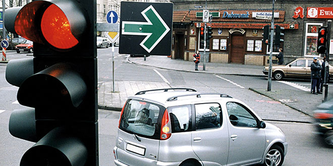 Der grüne Blechpfeil gestattet das Rechtsabbiegen an einer roten Ampel. Der Autofahrer muss dann auf den Querverkehr, sowie Fußgänger und Radfahrer achten und ihnen die Vorfahrt gewähren. Auf jeden Fall muss er vor dem Abbiegen anhalten, sonst drohen ihm ein Bußgeld von 70 Euro und ein Punkt in Flensburg. Bei Rad- und Fußübergängen gelten für Radfahrer die Fußgängerampeln, wenn keine spezielle Radfahrerampel besteht. Diese Regel gilt aber nur noch bis Ende des Jahres 2016. Achtung: Ab Januar 2017 müssen sich Radfahrer an der Ampel für Autofahrer halten, falls es kein eigenes Lichtzeichen für Radfahrer gibt. Ist eine Ampel ausgefallen, gelten die aufgestellten Verkehrszeichen. Sind keine vorhanden, so gilt die allgemeine Regel ‚rechts vor links‘. Je nach Situation können in einem solchen Fall auch Polizisten für einen reibungslosen Verkehrsfluss eingesetzt werden.