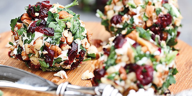 1. Getrocknete Cranberries hacken. Kräuter waschen, trockenschütteln, Blättchen abzupfen und ebenfalls hacken. Cranberries, Kräuter und Sesam in einem tiefen Teller mischen. Käse mit etwas Salz und Pfeffer verrühren. Mit einem Teelöffel nussgroße Portionen abstechen, in den Teller mit den Cranberry-Bröseln abstreifen, in den Bröseln wenden und zwischen den Handflächen kurz rund rollen. Die Bällchen bis zum Servieren zugedeckt im Kühlschrank aufbewahren.
