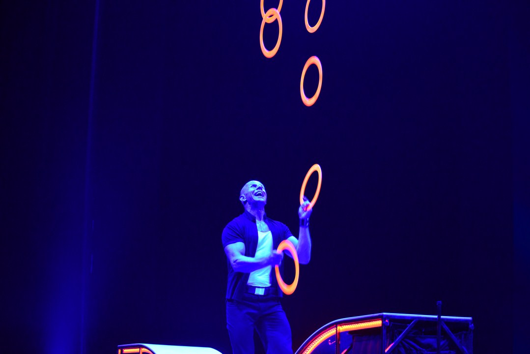 Einzelne Höhepunkte waren dabei schwer ausfindig zu machen, gebannt verfolgte das Publikum alle Darbietungen der Artisten. Künstlerin Liz Williams aus den USA führte ihre Luftartistik in einem weißen Tuch über den Köpfen der Gäste vor, bewegte sich mit Anmut und Präzision im Rahmen ihrer einzigartigen Choreografie. Bellowski verzauberte mit seinen kleinen und großen Seifenblasen, während das Zebra Stelzentheater aus München einen unvergesslichen Tanz schwebte und schwankte. Comedian Christoph Engels jonglierte mit Gurke, Melone und einer Kettensäge und nahm sich zwei Gäste aus dem Publikum gleich mit auf die Bühne, die so zu weiteren Stars des Abends wurden. Stehende Ovationen gab es aber vor allem für die Schweizer Ausnahmekünstlerin Marula Eugster, die mit einer Feder und 13 Palmblatt-Rispen eine Oase der Konzentration und Ruhe entstehen ließ und mit ihrem unbeschreiblichen Ballanceakt das Publikum mehr als faszinierte. Moderiert wird die Show von Conférencier und Zauberkünstler Stefan Alexander Rautenberg, der die Zuschauer stilvoll durch den Abend geleitet.