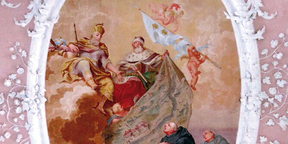 Das Kloster St. Mang zählt zu den frühen Klostergründungen des neunten Jahrhunderts, dessen kirchlich-seelsorgerische Ursprünge sogar noch älteren Datums sind und auf die Missionswirksamkeit des Klosters St. Gallen im Bodensee- und Alpenraum zurückgehen, personifiziert durch das Wirken des Heiligen Magnus, der in Füssen im achten Jahrhundert 25 Jahre gelebt haben soll. „Gegründet wurde das Kloster zwischen 817 und 860 als sogenanntes bischöfliches Eigenkloster“, erklärt Füssens Museumsleiter Dr. Anton Englert. „Hinter der Gründung standen aber vor allem auch machtpolitische Interessen. Denn für den Augsburger Bischof war der Lechübergang bei Füssen ein wichtiger Standort an der Fernstraße und ehemaligen Römerstraße Via Claudia Augusta zwischen Augsburg und Oberitalien.“ Genau hier liegt auch ein gewisser Zusammenhang zur Politik Karls des Großen, der sein fränkisches Reich in alle Richtungen ausweitete und wie schon seine Vorfahren darauf setzte, mit der römischen Kirche zusammenzuarbeiten. „Die Frankenherrscher standen damit für den römisch-katholischen Glauben nördlich der Alpen ein“, so Englert weiter. „Karl der Große wurde zu einem Schutzherren des Papstes, der ihn Weihnachten 800 zum Dank für seine Dienste zum ersten Kaiser des Westens seit dem Fall des weströmischen Reiches krönte. Mittelalterliche Klöster wurden, um sich selbst versorgen zu können, von ihren adligen Stiftern mit Ländereien und der dazugehörigen Landbevölkerung reich versehen. Damit erhielten die Äbte zwangsläufig eine Doppelfunktion aus geistlicher und weltlicher Herrschaft. Die Klöster waren ein aktiver Teil des gesamten Machtgefüges.“