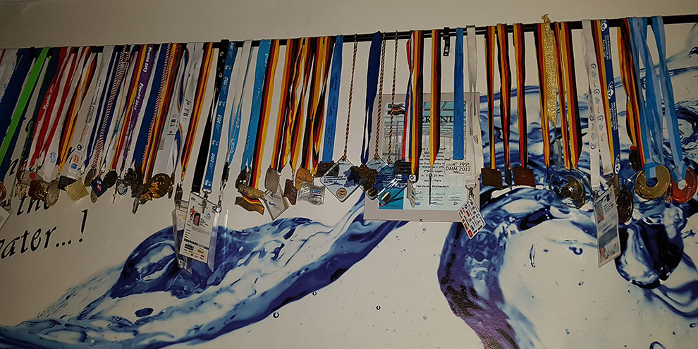 Das „Masters-Schwimmen“ gilt als der aktive Seniorensport im deutschen Schwimmsport. Rund 25.000 aktive Masters-Schwimmer zählt der Deutsche Schwimm-Verband in knapp 1.200 Vereinen. Hier werden bei den verschiedenen Altersklassen ab dem zwanzigsten Lebensjahr jeweils fünf Jahre zusammengefasst. „In meiner Altersklasse schwimmen rund 200 Frauen, da sind auch ehemalige Spitzensportler dabei, die zum Teil auch schon bei Olympischen Spielen oder anderen hochkarätigen Wettbewerben angetreten sind.“ Hier treffen sich also die jeweils besten der Welt. Wie etwa Dagmar Frese, die 1976 bei den Olympischen Spielen in Montreal antrat und nun mit Tina zusammen in der Mixed-Staffel schwimmt. Umso mehr wundert man sich dann schon, wenn jemand, der weder jugendliche Olympia-, noch WM-Erfahrung mitbringt, in dieser Klasse überhaupt mithalten und dann sogar auch noch große Erfolge erzielen kann. Denn immerhin hat Betina Hillmayr nach gut zehn Jahren Masters-Schwimmen schon eine wahre Vielzahl von Gold, Silber- und Bronzemedaillen eingefahren, ob bei Bezirks- und Landesmeisterschaften oder bei Deutschen Meisterschaften. Genauso ist sie aber auch international bei Europa- und Weltmeisterschaften am Start.