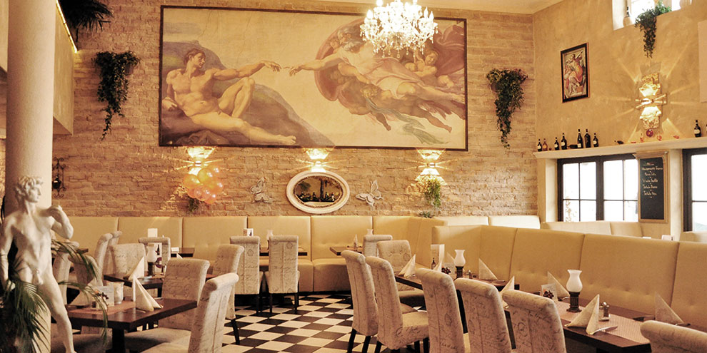 Jeder braucht ihn: Den Italiener des Vertrauens. Wo es immer die Lieblingspasta und ein großes Glas Wein gibt und die familiäre Atmosphäre direkt die Stimmung hebt. Die Adresse für den spontanen Sonntagabend mit großem Hunger, den Besuch der Schwiegereltern oder einen lustigen Abend mit den besten Freunden bei viel, viel Vino. Mitten in der Altstadt, genauer gesagt in der Luitpoldpassage, ist das “Michelangelo”. Früher einmal war es ein Kino, das Rex. Einige Füssener können sich noch an diese alten Zeiten erinnern. Heute befindet sich das „Michelangelo“ darin, ein schönes italienisches Restaurant in einem aussergewöhnlichen und historischen Ambiente. Der Name des Restaurants passt zum Flair des Lokals. Cremefarbenes Mobiliar, feines Besteck und an der Wand die Erschaffung Adams – ein oft reproduzierter Ausschnitt aus dem Deckenfresko des Malers Michelangelo Buonarroti in der Sixtinischen Kapelle. Auf der Empore sitzt man ebenso gemütlich, fast für sich allein – ideal für Geschäftsessen, Familienfeiern oder zu Zweit.