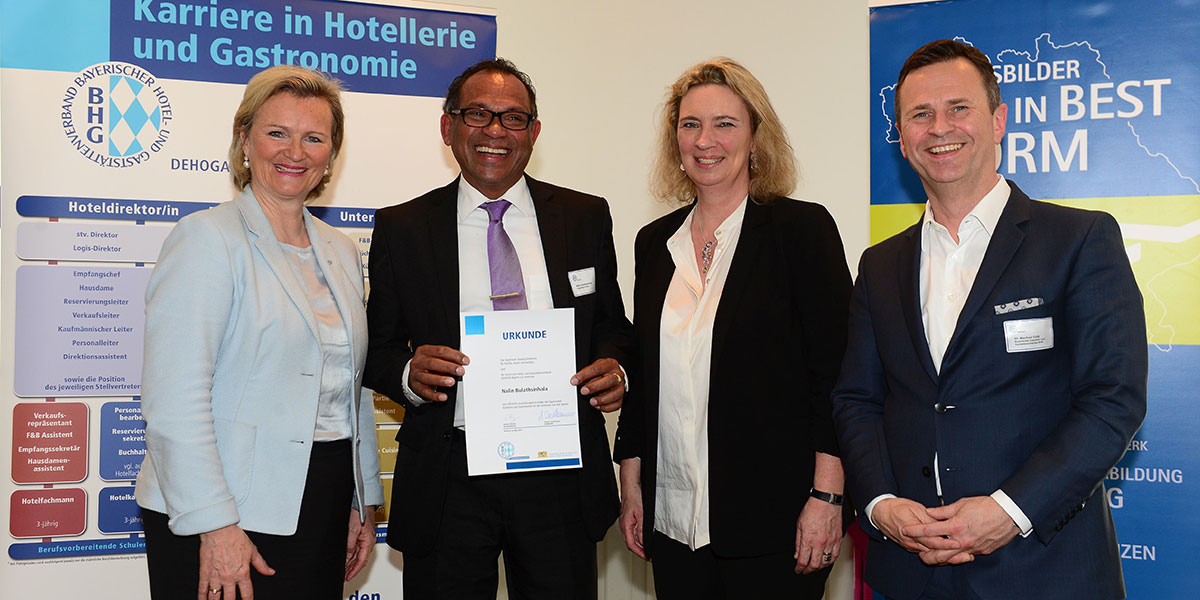 Als feierlichen Höhepunkt des Tages hat Bayerns Arbeitsministerin Kerstin Schreyer gemeinsam mit DEHOGA Bayern Präsidentin Angela Inselkammer und BIHK Hauptgeschäftsführer Dr. Manfred Gößl die Ernennungsurkunden des Bayerischen Arbeitsministeriums an die neu ernannten Ausbildungsbotschafter der bayerischen Hotellerie und Gastronomie verliehen, unter Ihnen Nalin Bulathsinhala vom Hotel Luitpoldpark aus Füssen.