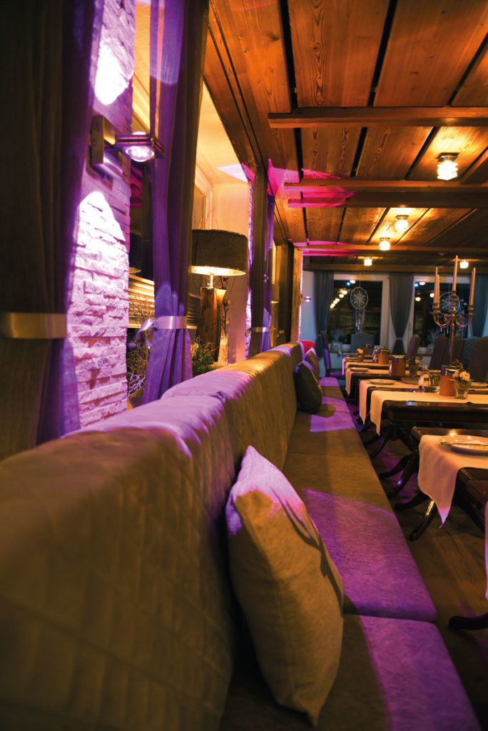 Das i-Tüpfelchen ist die dezente, indirekte Wandbeleuchtung, die eine warme Lichtstimmung zaubert. „Wir wollten aus diesem Teil des Raumes etwas ganz Besonderes machen“, erzählt Stefanie Geiger, die das Hotel gemeinsam mit ihrem Mann Klaus Geiger führt. Für etwa 50 Personen bietet das Alpinrestaurant Platz, für Feste jeder Art und sehr gutes Essen, ob a la carte über Menü bis zum Candle-Light Dinner.