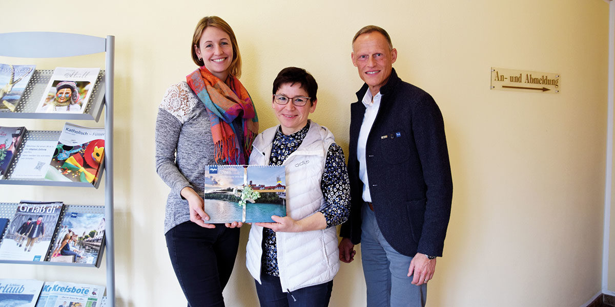 Die Erlöse aus Losverlauf und Christbaumversteigerung beim Adventsmarkt 2019 in Füssen spendet Füssen Tourismus und Marketing wieder für einen guten Zweck: Diesmal wird die Schulvorbereitende Einrichtung (SVE) an der Erich-Kästner-Schule Füssen unterstützt. Die SVE möchte mit der Spendensumme von 1.289,71 EUR einen Sommerausflug der betreuten Kinder in den Augsburger Zoo finanzieren, Spielfahrzeuge für den SVE-Garten anschaffen und therapeutische Reitstunden bezuschussen. Das Foto zeigt Tara Hartmann und Stefan Fredlmeier von Füssen Tourismus und Marketing bei der Spendenübergabe an Iris Kallmeyer (Mitte), die pädagogische Leiterin der SVE.