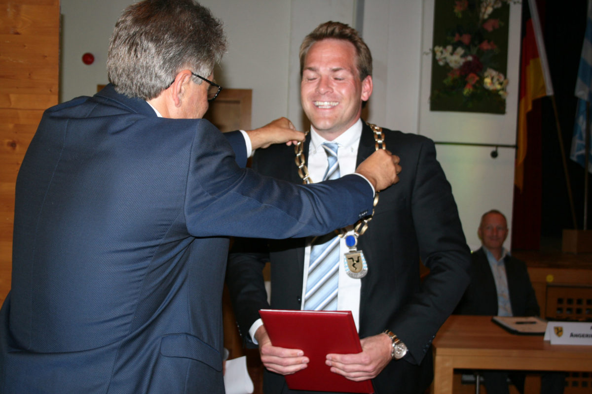Die Stadt Füssen hat nun auch einen offiziell vereidigten neuen Ersten Bürgermeister. Als Stellvertreter wurden die Stadträte Christian Schneider und Wolfgang Bader gewählt, was allerdings bei einigen Stadtratsmitgliedern doch auf etwas Verwunderung stieß. Maximilian Eichstetter legte am Abend in der konstituierenden Sitzung des Stadtrates, die aufgrund der Corona-Beschränkungen einzuhaltenden Abstände im Haus Hopfensee stattfand, den Amtseid auf das Grundgesetz der Bundesrepublik Deutschland sowie die Bayerische Verfassung ab. Vereidigt wurde er traditionsgemäß von dem nach Lebensjahren ältesten anwesenden Stadtratsmitglied, in dem Fall von Magnus Peresson. Direkt im Anschluss an die Vereidigung überreichte Hauptamtsleiter Peter Hartl dem neuen Bürgermeister auch die Amtskette.