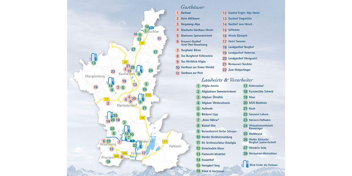 Das Besondere: Interessierte erfahren direkt auf der Speisekarte, von welchem Landwirt oder handwerklichen Verarbeiter aus der Region die verwendeten Lebensmittel stammen. Initiiert und koordiniert werden die Genusstage vom Landkreis in Zusammenarbeit mit Tourismusverband und Öko-Modellregion Ostallgäu, Bergaufland Ostallgäu sowie dem Amt für Ernährung, Landwirtschaft und Forsten Kaufbeuren.