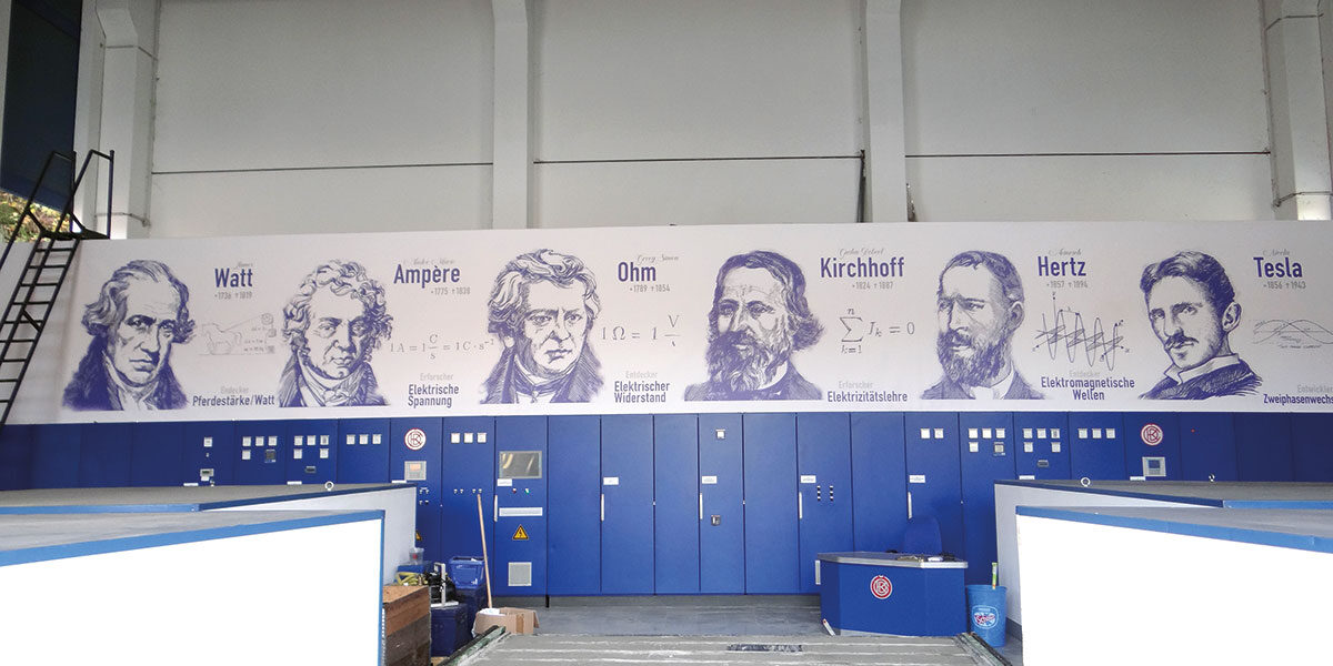 Das Elektrizitätswerk in der Füssener Lechhalde hat in diesen Tagen eine neue Bildinstallation bekommen. Inhaber Joe Huber hatte diese in Auftrag gegeben und der Künstler Alfons Schuber aus Trier hat das Werk Wirklichkeit werden lassen. Jetzt zieren ehemalige Pioniere der Wissenschaft, die bedeutende Entdeckungen rund um den Strom gemacht haben, die Wand im Füssener Wasserkraftwerk. Es hat eine Größe von 15,40 x 2,30 m und ist auf einer abwaschbaren Plane aufgedruckt worden. Darauf zu sehen sind die Portraits der Physiker James Watt, André-Marie Ampère, Georg Simon Ohm, Gustav Robert Kirchhoff, Heinrich Hertz und Nikola Tesla. „Es war schwierig, die Portraits im gleichen Look erscheinen zu lassen, aber Alfons Schuber hat das super hinbekommen“, freut sich Joe Huber.