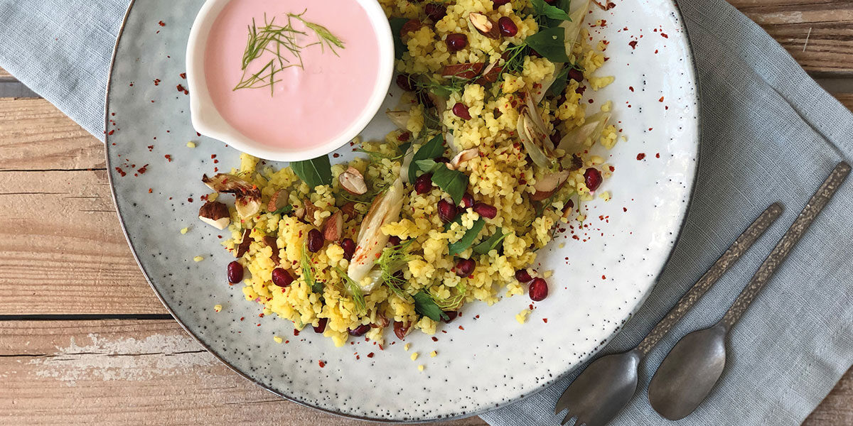 Bulgur mit Fenchel, Basilikum, Mandeln und den Granatapfelkernen vermengen und mit Salz, Pfeffer würzen. Auf einer Platte anrichten und mit der Soße servieren.