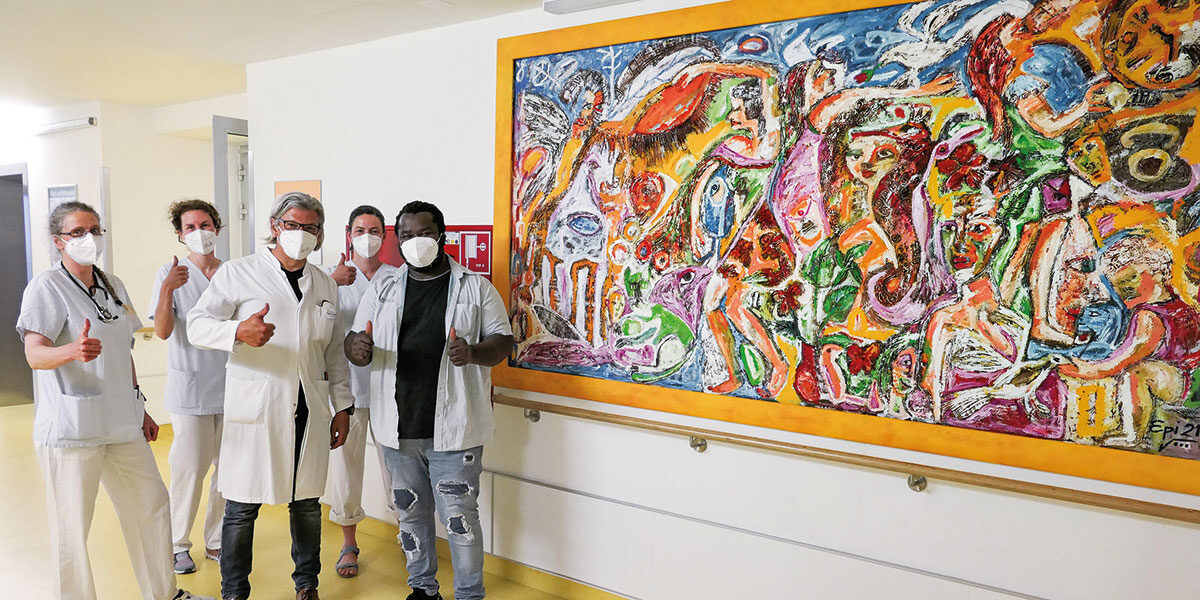 Gerade junge Patienten finden einen Aufenthalt im Krankenhaus verständlicher Weise oft unangenehm. Umso wichtiger sind Abwechslungen im Klinikalltag, beispielsweise durch Kunst, die beruhigen, ablenken oder den Geist anregen kann. Um eine weiße Krankenhauswand attraktiv für Kinder und Jugendliche zu gestalten kam der Kaufbeurer Künstler Epi Afanou in die Kinderklinik. In vier Tagen und 20 Stunden hat er sein Werk direkt auf die Wand aufgetragen und dabei teils mit 3D-Optik gearbeitet. Die Farben und den Rahmen spendete Günther Fischer von Art of Hair in Kaufbeuren. „Wir freuen uns riesig, dass wir mit Epi einen so leidenschaftlichen Künstler gefunden haben, der dies vor allem für unsere jungen Patienten gestaltet hat“, so der Chefarzt der Kinder- und Jugendmedizin Professor Markus Rauchenzauner. Aufmerksam begleitet wurde die Aktionskunst vom Team der psychosomatischen Versorgung, in deren Bereich das Kunstwerk an die Wand gemalt wurde. Das speziell geschulte, multiprofessionelle Team fängt Kinder und Jugendliche in akuten Krisensituationen auf. „Wir waren sofort begeistert von dem Projekt und freuen uns sehr über dieses lebensfrohe Kunstwerk, das sowohl Kinder als auch Erwachsene auf Fantasiereisen einlädt“, so Oberärztin Christina Herrmann. Epi malt seit seiner Kindheit, hat mittlerweile in der Kaufbeurer Altstadt im Ringweg sein Atelier und gibt Malunterricht für Kinder. Seine Werke haben eine farbenfrohe Gestaltung und in den Figuren und Motiven ist der togolesische Einfluss klar erkennbar, der auf die Herkunft des Malers schließen lässt. „Das Bild ist ein Prozess, ich habe an einer Stelle angefangen und wusste noch nicht, wie der Rest aussehen wird“, so der Künstler „Meine Werke sind da, um die Fantasie einzuschalten und zu benutzen. Jeder darf darin sehen, was er oder sie will. Auch nach Jahren entdecken die Menschen wieder neue Details in meinen Bildern, die ich zuvor noch nicht so gesehen habe. Das macht die Kunst aus.“
