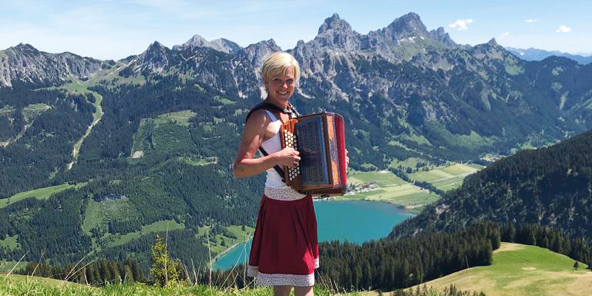 Es lag wahrscheinlich nicht nur daran, dass sie gerade ganz frisch von einer ihrer Wanderführungen für die Tannheimer Bergbahnen rund ums Neunerköpfle zurückkam, dass Christine Rauch kürzlich nur so von Freundlichkeit, Offenheit, und fröhlicher Ausstrahlung sprühte, als „Füssen aktuell“ sie auf ihrer Heimfahrt nach Kaufbeuren interviewte. Dort wohnt die 52-Jährige nämlich, die seit dem 1. Juli Touristengruppen die Bergwelt in Tannheim und dabei auch das besondere Gefühl ein Stückchen „Gipfelglück zu genießen“ näherbringt, was Rauch jedenfalls als ihren eigenen „Wunschtraum“ bezeichnet. Schließlich sind „meine Berge mein Ding“, erklärt die beruflich in der Finanzbuchhaltung tätige, gelernte Steuerfachgehilfin, die den Teilnehmern ihrer Führungen dabei zusätzlich kleine musikalische Ständchen auf einer „Steirischen“ serviert. Immerhin gehört das denn auch zu Rauchs Philosophie, das menschliche Dasein am besten „mit Musik in den Bergen“ zu verbringen und „mein Glück mit den Leuten zu teilen“. Dafür hat die blonde Frau, die außer der steirischen Harmonika noch Blockflöte und Gitarre spielt sowie in der Gruppe „Eschra“ singt, vor drei Jahren eine Ausbildung zur Bergführerin absolviert. Jetzt kann sie den Touristen, die ausschließlich aus Deutschland kommen ihr ganzes „Glück und große Zufriedenheit“ nahe bringen, die sie selbst aus dem Aufenthalt in der Natur und den Bergen schöpft.