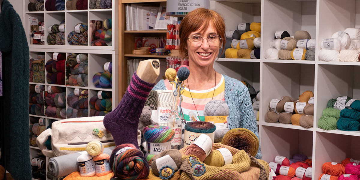 Seit 95 Jahren gibt es den schönen Laden mitten in der Altstadt von Füssen. Hier fühlt sich Eva Keller wohl, inmitten der Farbenpracht von Wolle, Garn, Nadeln und Knöpfen. „Bruggesser“ ist der einzige Laden seiner Art, den es noch in der Region gibt. Als sie das Geschäft angeboten bekam, war sie hin- und hergerissen. Ihr Mann war es schließlich, der zu ihr sagte „Überlege es dir gut!“. Sie wusste, ein zweites Mal würde sie so ein Angebot, das so ganz ihren Fähigkeiten entsprach, vielleicht nicht mehr bekommen. „Mein Mann weiß, wie ich ticke“, lacht sie. Nach dem Gespräch mit ihrer Familie sagte sie schließlich zu.