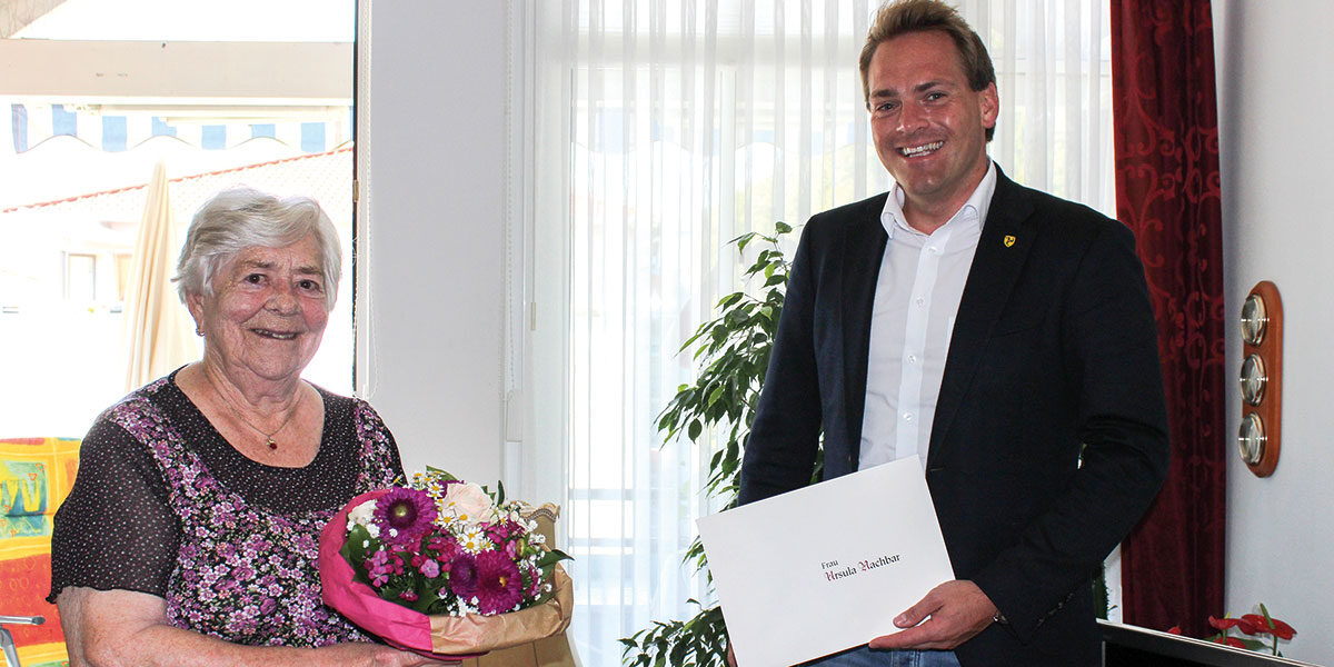 Bürgermeister Maximilian Eichstetter hat kürzlich Ursula Nachbar zu ihrem 90. Geburtstag gratuliert. Bei dem Treffen überreichte er der Jubilarin eine Grußkarte, eine Flasche Wein und einen Blumenstrauß. Nachbar und ihr Mann Manfred erzählten bei dem Besuch des Rathauschefs von ihrem erlebnisreichen Leben. Etwa, dass sie früher viel unterwegs waren – z.B. in Amerika oder Australien. Wenn sie zuhause waren, verbrachten die Nachbars gerne Zeit mit der Familie im Garten. „Die Liebe hält jung“, sagte Manfred Nachbar. Das Ehepaar zog vor 22 Jahren von Pforzheim nach Füssen.