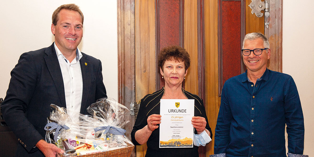 Für 25 Jahre Dienst als Reinigungskraft in der Mittelschule ist Swetlana Lorenz geehrt worden. Bürgermeister Maximilian Eichstetter (links auf dem Foto) und ihr direkter Vorgesetzter, Erwin Wankmiller, Hausmeister der Mittelschule, gratulierten ihr zu ihrem Jubiläum.