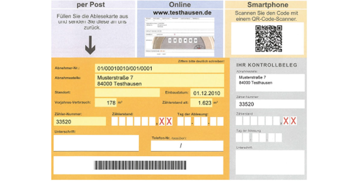 Am 26.11.2021 werden die Ablesekarten an die Eigentümer versandt. Die Karten können ausgefüllt und portofrei zurückgesandt werden. Die Übermittlung des Zählerstandes ist auch bequem online oder mit dem Smartphone über den QR-Code möglich.