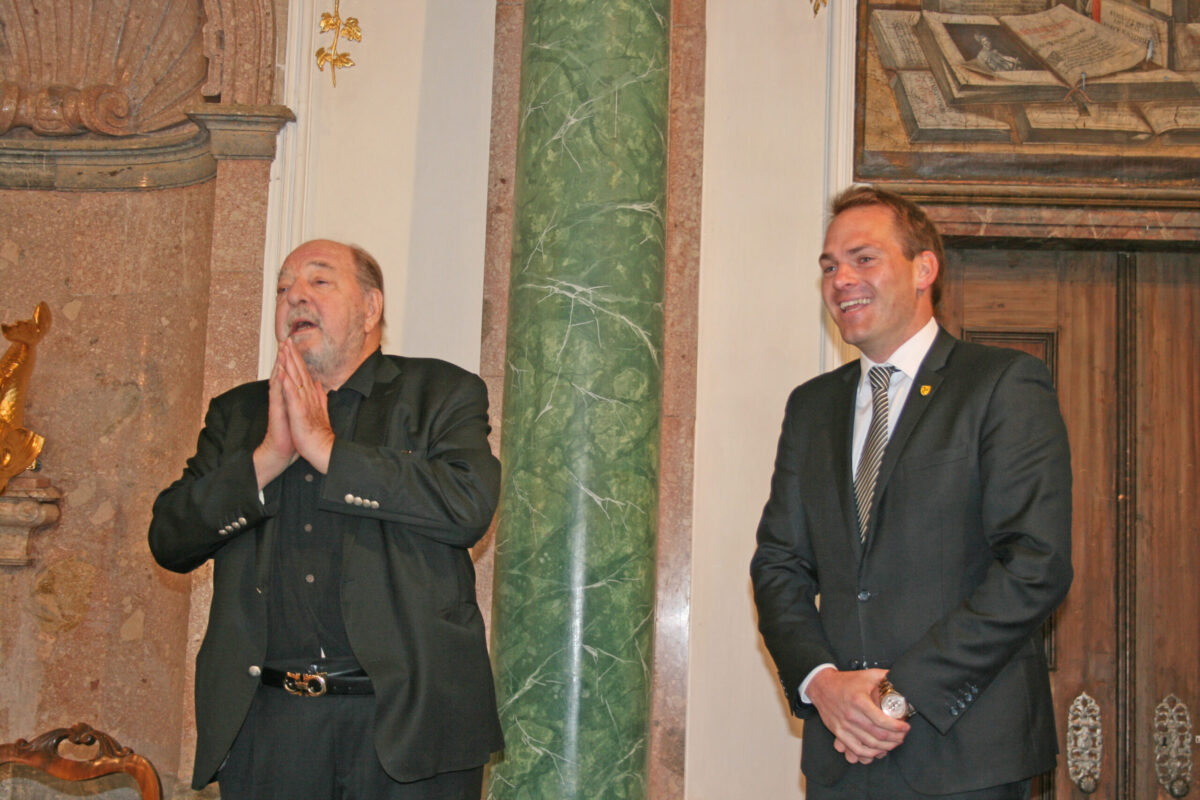 Mit einem Eintrag in das Goldene Buch der Stadt Füssen ist Ralph Siegel am Mittag offiziell geehrt worden. Der Komponist hat sich anlässlich des großen Erfolges von „Zeppelin – das Musical“ im Kaisersaal des Klosters St. Mang in dem Buch verewigt. „Die Worte Ralph Siegel, Zeppelin und Füssen sind nahezu unzertrennbar geworden. Wir sind sehr geehrt, dass Sie das hier bei uns durchführen“, so Füssens Bürgermeister Maximilian Eichstetter in seiner Ansprache.
