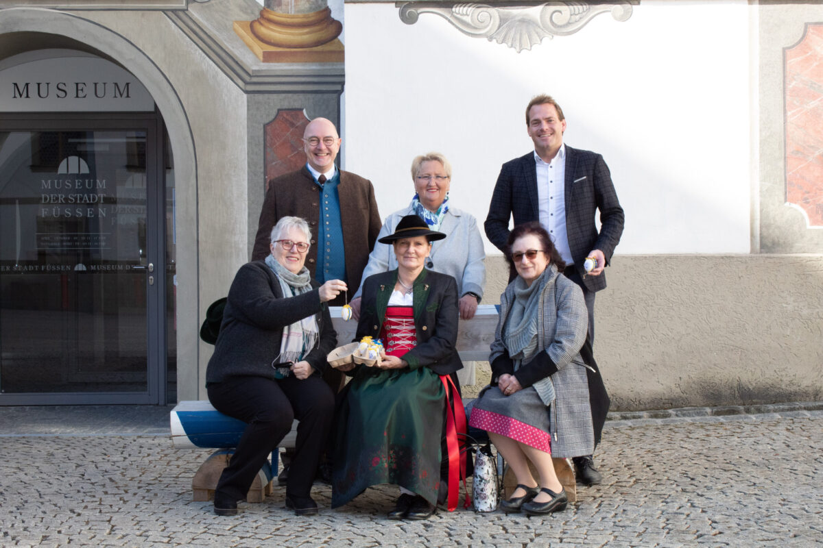 Das Allgäuer Heimatwerk hat 2.000 Euro für die Ukrainer gespendet. Das Geld kam durch den Verkauf von bemalten Ostereiern zusammen, die fünf bis sechs Ehrenamtliche bemalen und für neun Euro das Stück verkaufen. Noch bis Ostern verkauft das Allgäuer Heimatwerk die Eier zu Gunsten der notleidenden Menschen in der Ukraine. Das Foto zeigt (hinten von links:) Richard Hartmann (Projektleiter Allgäuer Heimatwerk), Marlies Kössel (Ehrenamtliche), Bürgermeister Maximilian Eichstetter und (vorne von links:) Christine Strouhal, Petra Schadt und Waltraud Osterried (alles Ehrenamtliche) bei der Übergabe. Das Geld kommt der Spendenaktion der Stadt Füssen zu Gute, die Eichstetter ins Leben gerufen hat. Die Spenden gehen an die Kaufbeurer Hilfsorganisation humedica, die Hilfsgüter in Richtung Ukraine schickt.