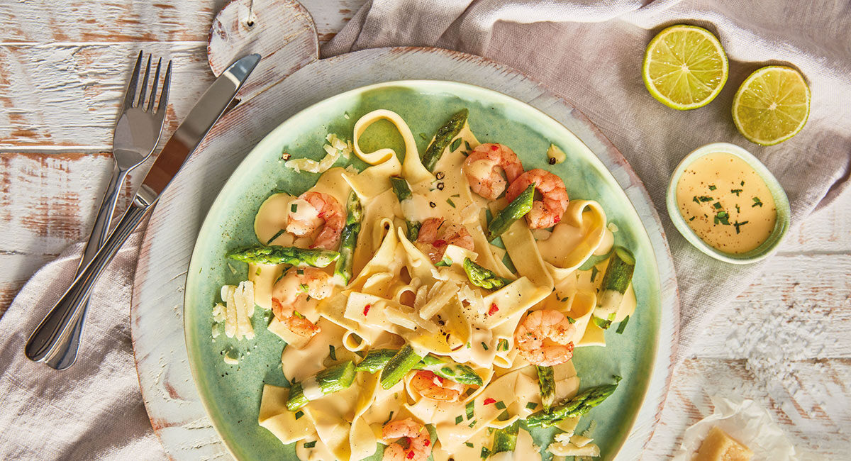 Ein köstliches Nudelgericht mit grünem Spargel und leckeren Garnelen. Eine selbstgemachte und wunderbar cremige Hollandaise rundet das Rezept ab.
