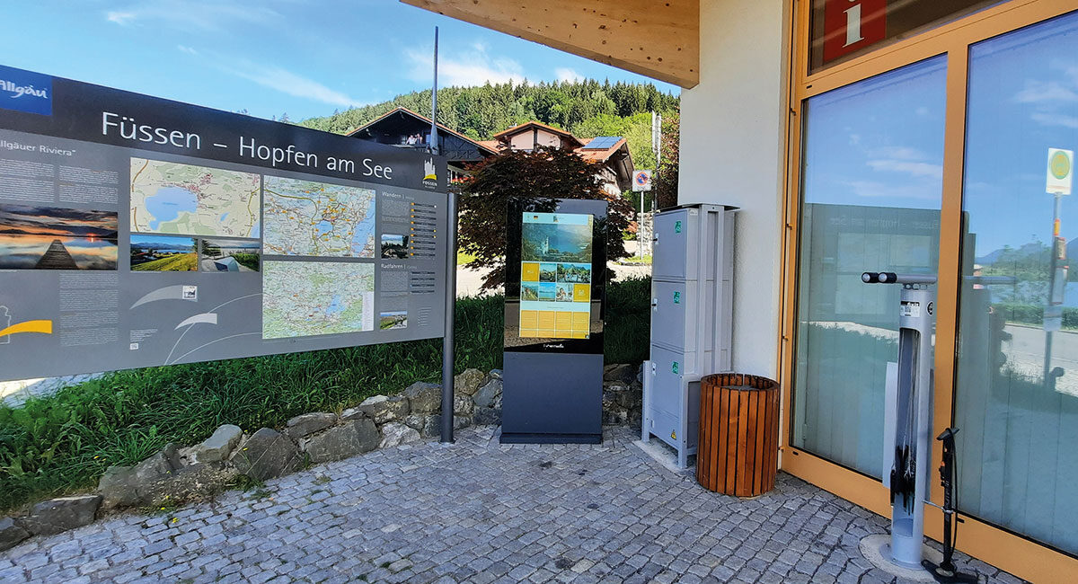 Zusätzlich kann man in der Tourist Information Füssen einen mobilen Reparaturkoffer und eine Luftpumpe ausleihen. Ein weiteres 24/7 nutzbares Reparatur-Tool für die Erstversorgung samt Radpumpe gibt es jetzt an der Tourist Information im Ortsteil Hopfen am See.