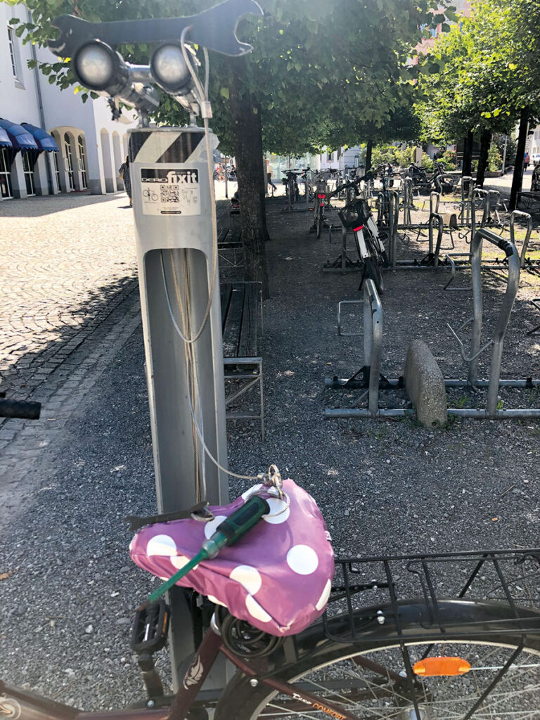 Reifen platt? Oder muss am Drahtesel auf die Schnelle eine Radmutter nachgezogen werden? Am Informationspavillon an der Tourist Information Füssen gibt es schon seit einigen Jahren eine kleine Reparaturstation mit Werkzeug, das Radler bei Radpannen nutzen können.