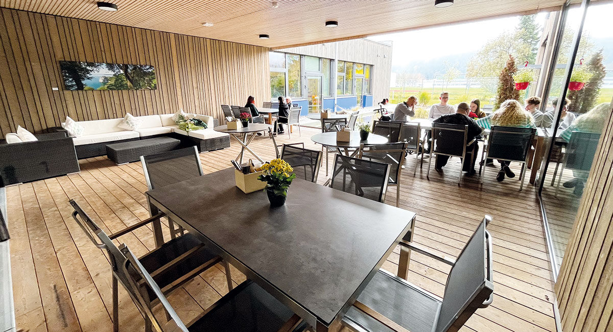 Dieses Glück guten Essens kann man im „Werkgeplauder“ unter der Woche genießen. Jeden Tag gibt es mittags zwei Gerichte: mit Fleisch und vegetarisch. Nachmittags gibt selbstgebackenen Kuchen. Zubereitet wird alles von einem engagierten Team von zwölf Beschäftigten, dem Koch Norbert Vogtland und dem Konditormeister Harald Sorgenfrei. „Viel zu oft werden Menschen mit Behinderungen von uns in ihren Fähigkeiten und Talenten unterschätzt und mit dem Café können wir zeigen, dass es das nicht braucht“, erklärt Sozialpädagogin Dagmar Rothemund. Serviert werden das Essen und die Getränke von den Beschäftigten der Wertachttal-Werkstätten. Alle Produkte sind Bio und regional. „Für uns ist es wichtig, die Nachhaltigkeit zu unterstützen. Dieses Zusammen oder Miteinander, egal welchen Namen man dem Kind gibt, hat es überhaupt möglich gemacht, dass wir so arbeiten können“, erklärt die Leiterin. Die Gäste des „Werkgeplauder“ sind Einheimische, aber auch Mitarbeiter der umliegenden Firmen. „Wir haben ein schönes Ambiente. Die Gäste können sowohl drinnen als auch draußen sitzen“, so Dagmar Rothemund die den Außenbereich mit dem Blick auf den Teich zeigt, der gesponsert wurde und aus Sicherheitsmaßnahmen nur wenige Zentimeter tief ist.