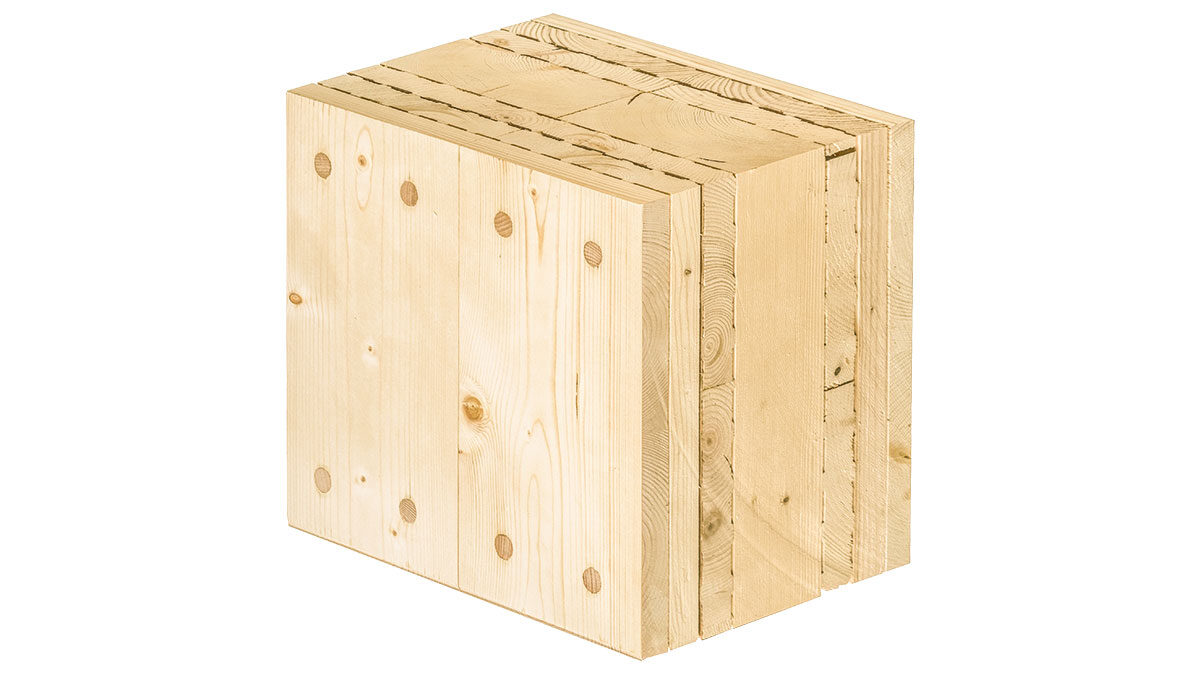 Eine zwischen 17 und 36 cm dicke Holz100-Wand besteht aus mehreren, drei Zentimeter dicken Brettern, die dank sanfter Einfräsungen genug Raum zum Atmen haben. Da der unter Hochdruck gepresste Buchenholzdübel Feuchtigkeit aufnimmt, quillt er auf und hält die einzelnen Bretter bombenfest zusammen. Nach diesem patentierten Prinzip werden also die natürlichsten Häuser gebaut.