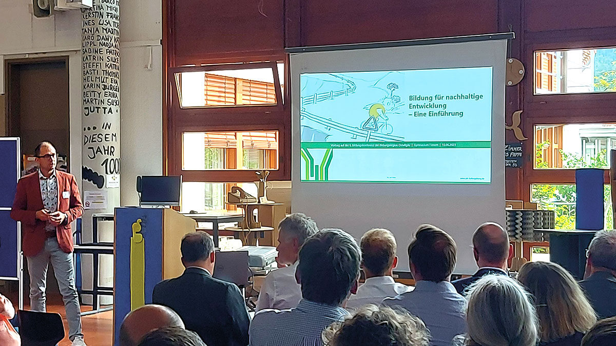 Wie die einzelnen Schritte und die Umsetzung von Klimaschutzmaßnahmen auf dem Weg zur Klimaschule konkret aussehen können, haben die verantwortlichen Lehrkräfte des Gymnasiums Füssen bei der diesjährigen Bildungskonferenz der Bildungsregion Ostallgäu im Juni 2023 gezeigt. Sie berichteten dort zum Beispiel von einem Baumpflanzprojekt an der Füssener Ache. Des Weiteren befassten sich die Schülerinnen und Schüler des Gymnasiums im Rahmen von Klimaexperimenten mit verschiedenen Nachhaltigkeitsthemen.