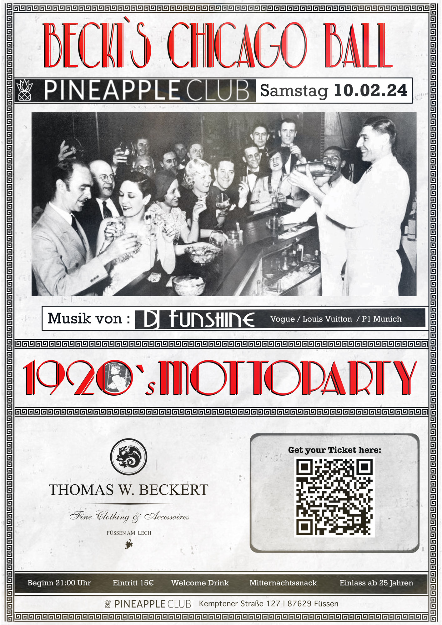 Der Künstler und Designer Becki und die beiden Clubbesitzer Sam & Louis präsentieren am Samstag, den 10.02.23, im Pineapple Club eine einzigartige Mottoparty. Ganz im Stil der legendären 1920er Jahre laden die drei Herren herzlich zum Chicago-Faschingsball ein. Dann heißt es Eintauchen in das glamouröse Flair der „Golden 20s“, ein ausgelassenes Lebensgefühl.