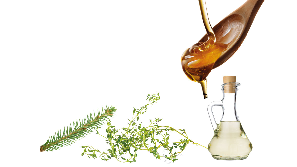Ein weiteres Rezept ist der Hustenoxymel. 250 g einer Mischung aus Fichtennadeln (diese auch am besten wieder im Frühling gesammelt, und zwar die jungen weichen Triebspitzen), Thymian und Spitzwegerich, 600 g Waldhonig, der ist auch schön flüssig, 1 Tasse Apfelessig.