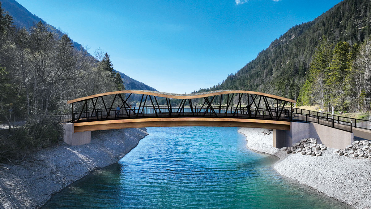 Ausgeführt wird die Brücke als Stahlbetonverbundtragwerk, bestehend aus zwei schweren Schweißträgern und einer Betonplatte, ergänzt durch ein aufgesetztes Flugdach in Holzbauweise. Die Stirnseiten des Daches sowie die sichtbaren Teile der Beton- und Stahlkonstruktion werden mit Lärchenholz verkleidet, während die tragenden Stahlträger eine spezielle Beschichtung erhalten, um ihre Langlebigkeit zu sichern. Mit einer Spannweite von 31 Metern und einer entsprechenden Durchfahrtshöhe ermöglicht die Konstruktion zukünftig eine ungehinderte Durchfahrt der Wasserrettung. Die neue Brücke fügt sich somit nahtlos in die landschaftliche Umgebung ein.