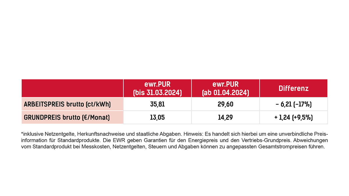 Ab April zahlt ein Durchschnittshaushalt mit einem Jahresverbrauch von 3.500 kWh im ewr.PUR Tarif rund 1.200 Euro pro Jahr, was im Vergleich zum Vorjahr eine Ersparnis von über 200 Euro ergibt. In der Grundversorgung ergibt sich bei jährlichen Kosten von rund 1.400 Euro eine Ersparnis von über 350 Euro.
