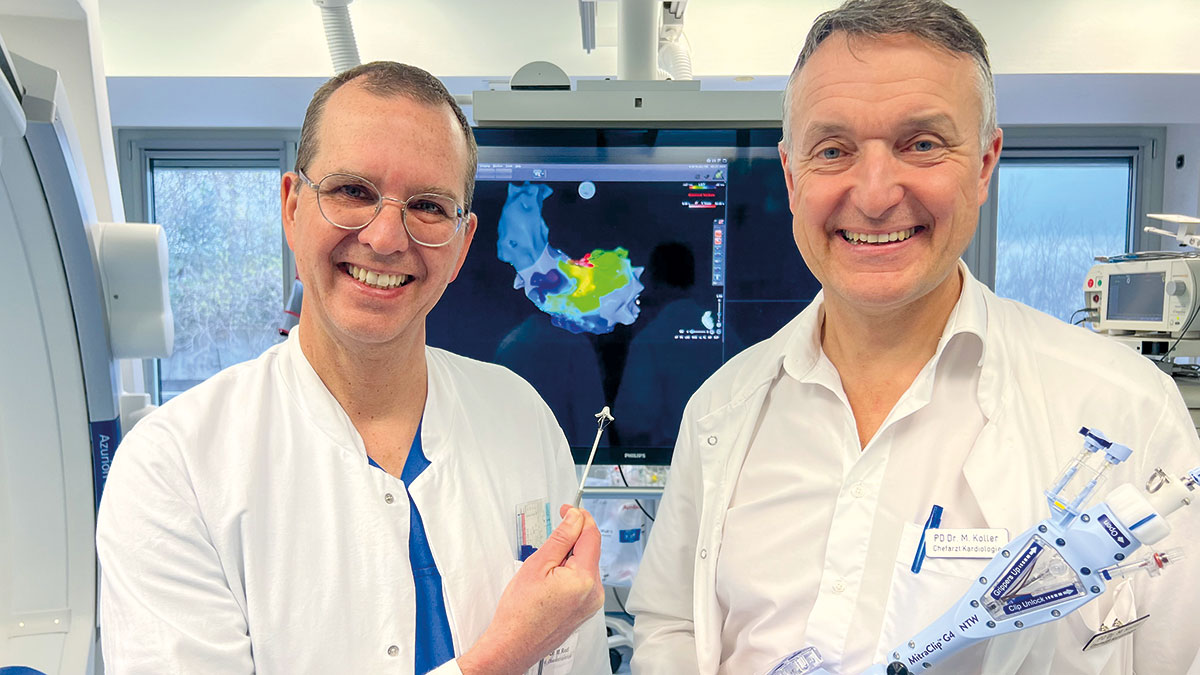 Privatdozent Dr. Marcus Koller pflichtet seinem Kollegen bei. „Durch die immer älter werdende Gesellschaft tritt die Herzschwäche infolge einer undichten Mitralklappe immer häufiger auf“, blickt der Leiter des Herzzentrums Ostallgäu-Kaufbeuren in die Zukunft. „Ich bin daher sehr froh, dass wir durch diese wichtige Erweiterung unseres interventionellen Spektrums den von uns betreuten Herzpatienten eine heimatnahe Versorgung auf hohem Niveau anbieten können.“ Es seien mehrere internationale Schulungen zum Erwerb der Kompetenzen zur sicheren Anwendung des MitraClip- Verfahrens notwendig gewesen, so Koller weiter.