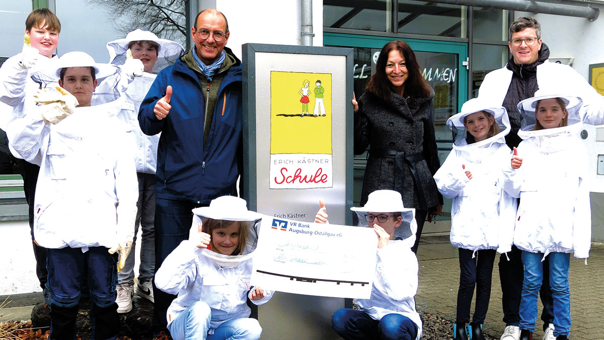 Die Imker-AG der Erich Kästner Schule Füssen bekam von der VR Bank Augsburg-Ostallgäu eG eine Spende von 1000 Euro für den Bau eines Bienenstandes für vier eigene Bienenvölker. Angela Hirtl überreichte im Namen der VR Bank Augsburg-Ostallgäu die Spende. Voller Tatendrang und Vorfreude blicken die Nachwuchsimker nun der Fertigstellung des Bienenstandes, der auf dem schuleigenen Acker aufgestellt wird, entgegen.