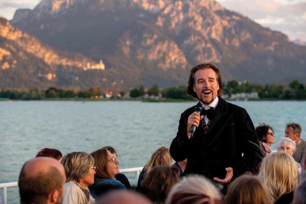 Die musikalische Abenteuer-Reise beginnt mit einem besonderen Highlight: der stimmungsvoll inszenierten Einfahrt der MS „Füssen“ in den Bootshafen. An Bord erwarten „Sisi & Ludwig“ alias Janet Chvatal und Marc Gremm sowie Tanja Versal ihre Gäste.