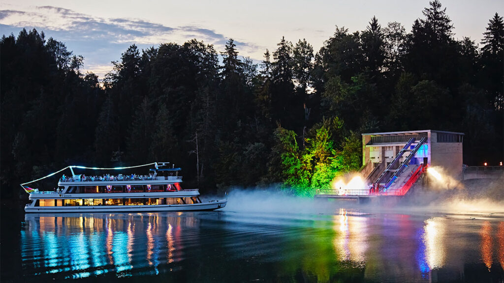 Auf der anderen Seite des Sees erwartet die Mitreisenden ein weiteres Highlight aus König Ludwigs Fantasiewelt: Das Wasserkraftwerk Roßhaupten wird illuminiert und verwandelt sich in eine mittelalterliche Gralsburg. Hier erscheint ein „Magischer Schwan“ mit imposanten 30 Meter breiten Flügeln aus Wasser – ein beeindruckender Anblick.