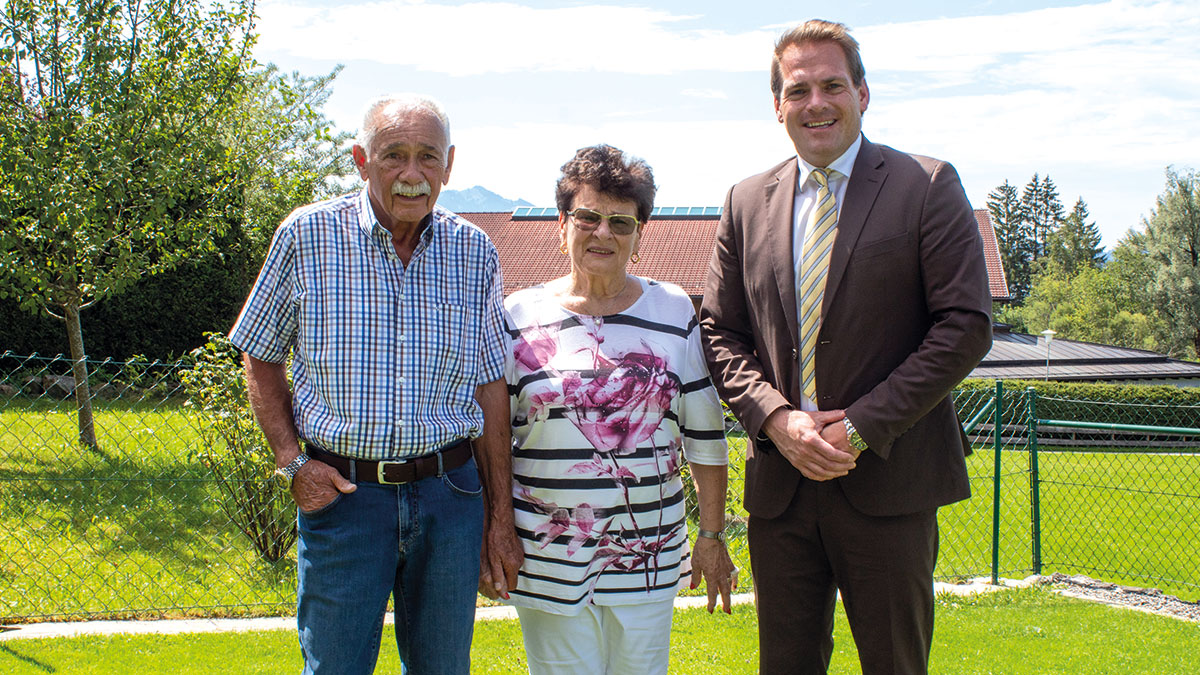 „Herzlichen Glückwunsch zu 60 Jahren gemeinsame Erinnerungen, zu 60 Jahren gemeinsame Familienentwicklung. Auch war es immer schön zu sehen, wie Sie sich gegenseitig im Unternehmen Unimet eine Unterstützung waren,“ gratulierte Füssens Bürgermeister Maximilian Eichstetter (rechts) Elfriede und Rudi Kolb zur Diamantenen Hochzeit.