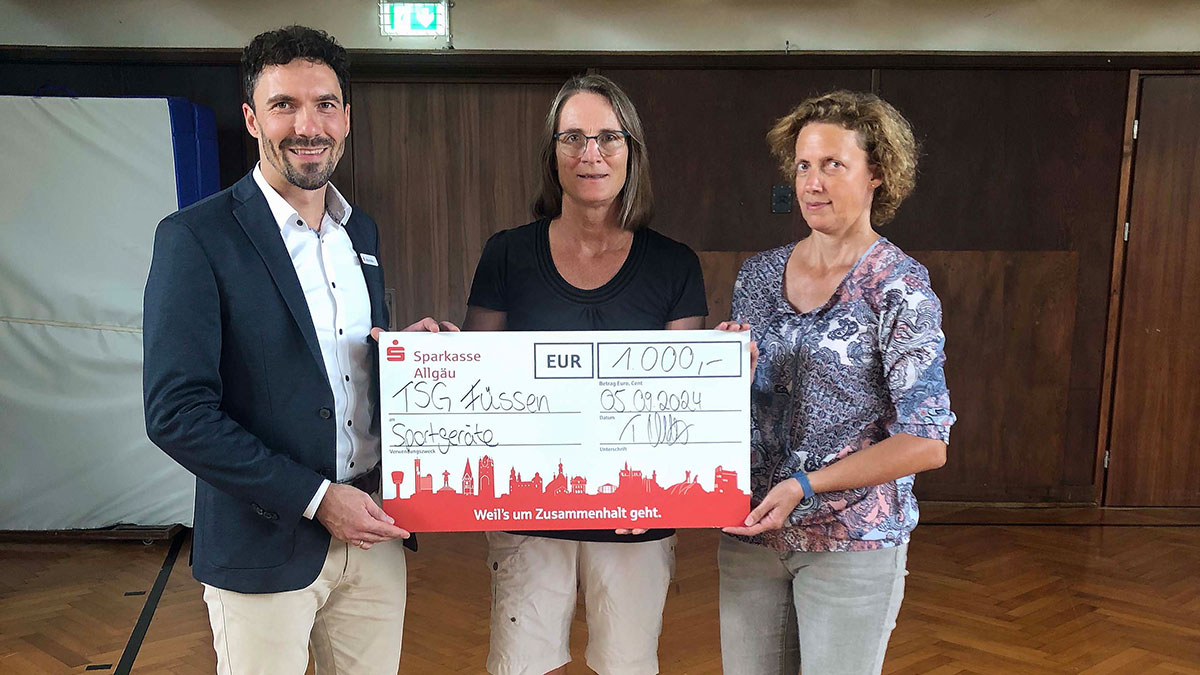 Passend zum Start ins neue Schuljahr überreichte Tobias Kattler, Leiter der Sparkassenfiliale Füssen, eine Spende in Höhe von € 1000 an die TSG Füssen, vertreten durch die 1. Vorsitzende und Abteilungsleiterin Turnen, Silke Faßhold und die Abteilungsleiterin Leichtathletik, Marion Gumtau-Langer. „Die Spende werden wir in bessere und umfangreichere Trainingsmöglichkeiten für die Kinder und Jugendlichen investieren“, freute sich Silke Faßhold.
