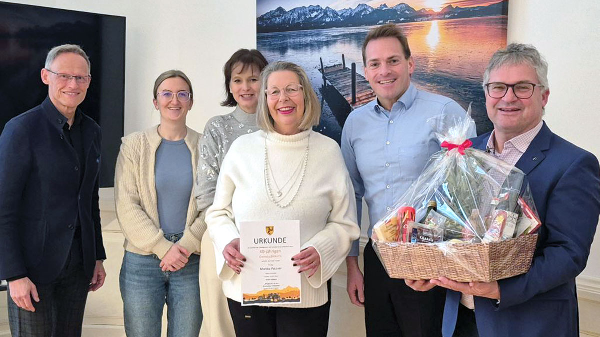 Offen, hilfsbereit und freundlich, so bezeichnen die Kollegen und Kolleginnen Monika Patzner, die auf 40 Jahre im Dienst der Stadt und Füssen Tourismus und Marketing (FTM) zurückblicken kann. „Monika Patzner ist ein echtes Vorbild für den kommunalen Dienst.Ihre Motivation, Freundlichkeit und ihre Bereitschaft, Veränderungen nicht nur anzunehmen, sondern aktiv mitzugestalten, haben die Stadt Füssen bereichert. Wir sind stolz und dankbar, sie im Team zu haben,“ so Füssens Bürgermeister Maximilian Eichstetter bei seiner Ansprache.